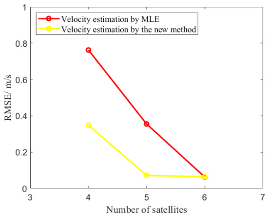 Figure 9 shows the variation curve of the with the number of satellites. It can be seen from Figure 9 that, when four satellites were used for target localization, the root mean square error of localization results by [13] could reach 200 m. When the number of positioning satellites reached more than five, the root mean square error of system positioning was within 50 m. Meanwhile, it can be seen that, when the satellite number reached to six, the new method, as well as the method in [7], could achieve the same localization accuracy.