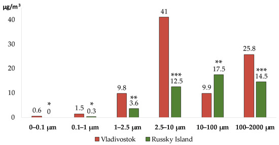 Ultrafine particles were not detected in the area with insignificant man-made load. The concentration of particles 0.1–1 µm in size was 0.3 (0; 2.5) µg/m3. The content of fine particles ranged from 1 to 2.5 µm was 3.6 (0.5; 6.0) µg/m3, and particles from 2.5 to 10 µm were detected at 12.5 (2.3; 23.5) µg/m3. On Russian Island, particles with a size from 10 to 100 µm (PM > 10) were detected at a concentration of 17.5 (5.1; 38.9) µg/m3, and particles ranged from 100 to 2000 µm (PM > 10) were detected at a concentration of 14.5 (0; 27.2) µg/m3.