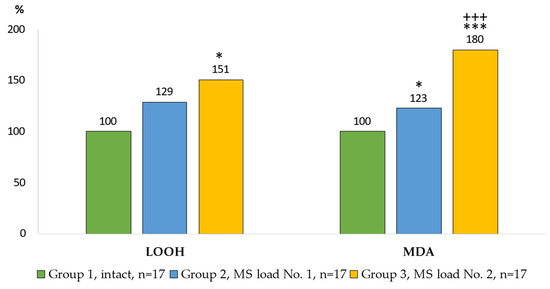 The level of LOOH in the Group 2 did not differ from the control group. The content of LOOH in the Group 3 was 51% higher than in the control group. The greatest increase in the level of MDA production in comparison with the control group was noted in the Group 3 of AM (80%), and it was 46% higher (p = 0.003) compared with the Group 2.
