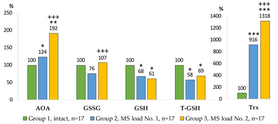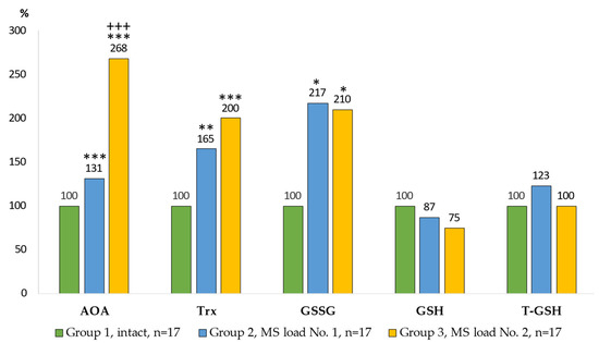 The content of oxidized glutathione was not statistically significant different from the control group. The level of reduced glutathione in the Group 2 was 32% lower (p = 0.034) and 39% lower (p = 0.0495) in the Group 3 compared with the control. The level of total glutathione in the Group 2 was reduced by 42% (p = 0.0495) and in the Group 3 by 31% (p = 0.0495) compared with the control. The content of thioredoxin in the Group 2 was 9 times (p = 0.00004) higher than in the Group 1. In the Group 3, the level of thioredoxin was 13 times (p = 0.00002) higher than in the control group, and 44% (p = 0.0045) higher than that in the Group 2.