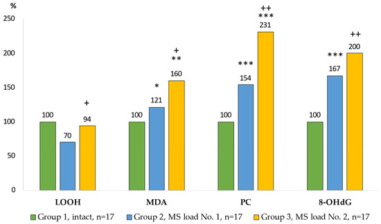Due to exposure to MS No. 2, the level of LOOH was increased by more than a third compared to the Group 2. The content of MDA in the Group 3 was 33% higher compared with the Group 2. The largest increase in protein carbonyl (PC) levels (by 2.3 times) was found in the Group 3 (p = 0.0001). The content of 8-OHdG compared with the control group was 67% higher (p = 0.0001) in the Group 2 of AM, and in the Group 3, the content of 8-OHdG increased two-fold (p = 0.0001) compared with the control group and by 20% (p = 0.0001) compared with the Group 2.