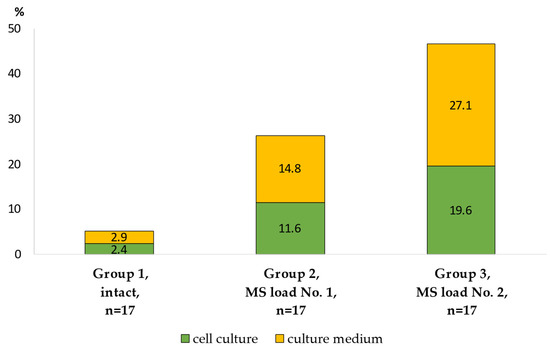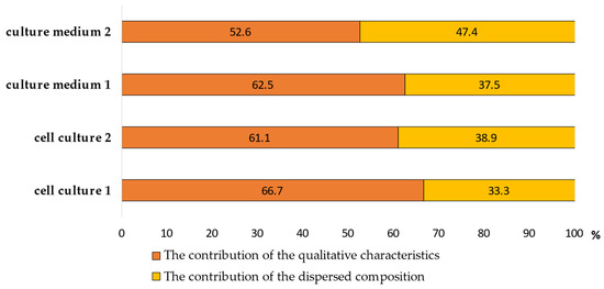 The contribution of the dispersed composition of MS No. 1 was 33.3% in the cell culture and 37.5% in the culture medium, and when exposed to MS No. 2 it was 38.9% in the cell culture and 47.4% in the culture medium. The contribution of the qualitative characteristics of SPM when exposed to MS No. 1 was 66.7% in the cell culture and 62.5% in the culture medium, and when exposed to MS No. 2: it was 61.1% in the cell culture, and 52.6% in the culture medium.