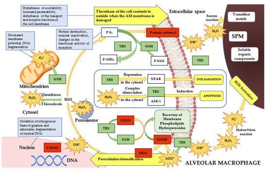 Exposure to fine and ultrafine particles causes ROS-mediated oxidative stress. The main free radical in the lungs is hydrogen peroxide. SPM interaction with hydrogen peroxide results in the formation of highly reactive hydroxyl radicals via the Fenton reaction. Additionally, the formation of hydroxyl radicals via the Haber–Weiss reaction is caused by superoxide induced by particles with a size of less than 2.5 µm. Along with this, the alveolar macrophages themselves generate oxidants during the phagocytosis of fine particles, caused by the leakage of superoxide during the destruction of the mitochondrial matrix. Thus, the increase in peroxidation products is due to the fact that SPM up to 1 µm and with a size from 1 to 2.5 µm increased the amount of ROS and free radicals to the greatest extent and contributed to the intensification of oxidative reactions (Figure 8).