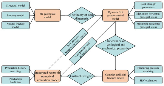 The numerical simulation method was used to investigate the feasibility of CO2-PPEF in the A83 block. In recent years, the integration modeling technology has gradually become an important means of unconventional resources development. Cipolla et al. proposed an integrated workflow of geological engineering for unconventional reservoirs to achieve seamless integration of the whole process from seismic data interpretation to productivity simulation [30]. Porcu et al. investigated the variation of three-dimensional stress field after hydraulic fracturing of shale gas multi-well group, optimization design of well completion plan, refracturing plan, and well spacing by means of integrated geological engineering method [31]. Di et al. proposed an AI-based geology–engineering integration method, treating exploration and development as an organic whole [32]. Based on the idea of integration, the modeling can be divided into three steps, including the dynamic 3D geomechanical modeling, complex artificial fracture networks modeling, and integrated numerical simulation. After modeling, the post-fracturing productivity of conventional volume fracturing and CO2-PPEF can be predicted and compared to verify the applicability of CO2-PPEF in the A83 block.