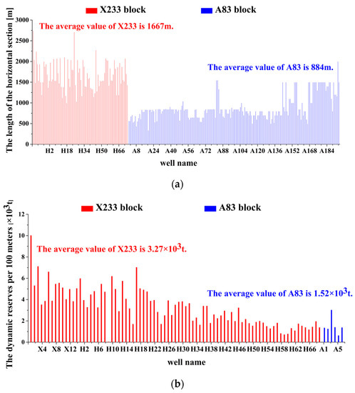 Comparison of horizontal section length (a) and dynamic reserves per 100 m (b) of blocks A83 and X233.