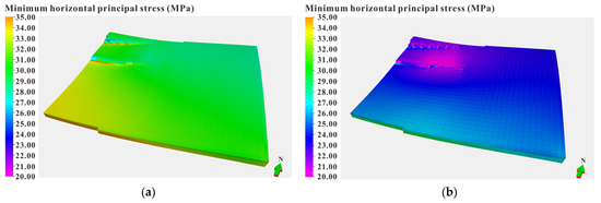The dynamic 3D geomechanical model of the Chang 7 member of the Yanchang Formation in the A83 block: (a) the minimum principal stress model before production and (b) the minimum principal stress model after one year’s production.