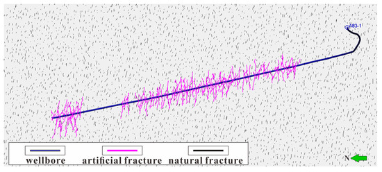 The complex artificial fractures model of well A83-1 was established using the unconventional fracture model (UFM); thus, phenomena, such as “stress shadow” and inter-well interference between fractures, can be simulated. As shown in Figure 4, after considering natural fractures and stress shadow, the morphology of artificial fractures is very complex rather than the simple double-wing symmetrical fractures.