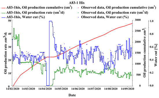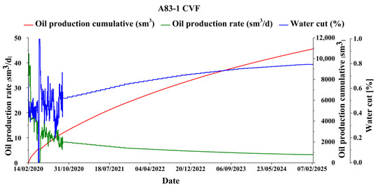 By analyzing the production data (Figure 6), it was found that the water cut of well A83-1 was as high as 45% in the first month of production after fracturing, and the daily oil production at the initial stage could reach the highest level of 43.5 sm3/d, which proved that good reservoir stimulation effects had been achieved. However, the daily oil production dropped by 50% within only half a month, and the water cut rose to more than 50%, which indicated that the formation energy of well A83-1 was insufficient to restrain the rise of water cut, resulting in a rapid decline in oil production.