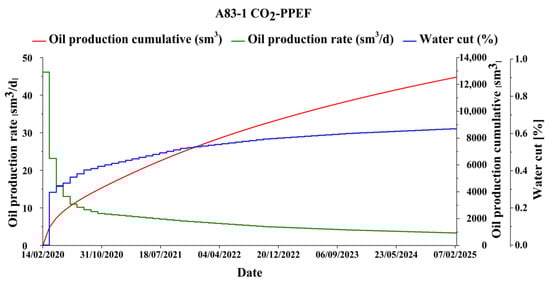 By contrasting the production prediction of conventional volume fracturing and CO2-PPEF in well A83-1 (Table 5), it was found that due to the energizing effect of CO2, the initial maximum production was slightly increased from 43.5 sm3/d to 46 sm3/d, the production decline rate slowed down, and the cumulative oil production increased by about 11.8% compared with conventional volume fracturing. In the early stage of production, due to the “gas cap” effect of CO2, the time of water breakthrough was delayed by one month, and the final water cut also dropped from 79% to 62.5% at the end of five years. In general, compared with conventional volume fracturing methods, CO2-PPEF has a better stimulation effect. It also proved that the CO2-PPEF has good feasibility in the A83 block.