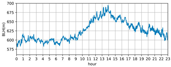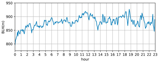 In addition, daily average data for the boundary layer height are also calculated. Sansha’s daily average variation in boundary layer height is shown in Figure 2, while Hefei’s daily average data are shown in Figure 3. As Figure 2 illustrates, the daily variation in boundary layer height in Sansha is not big. The standard deviation of Sansha’s daily BLH average is 19.6. According to the relation of BLH and temperature described before, the slow increase in BLH from 0 am to 11 am is due to a temperature increase in the morning. However, since the daily temperature variation is more significant in Hefei, the boundary layer height has a bigger variation, as shown in Figure 3. The increase in BLH from 0 am to 1 pm is due to the temperature increase in the morning. The decrease in BLH from 3 pm to 12 pm is due to the cool down in the evening. The standard deviation of Hefei’s daily BLH average is 26.69. Furthermore, the hourly average boundary layer height for Sansha and Hefei are 876.46 m and 623.92 m, respectively.