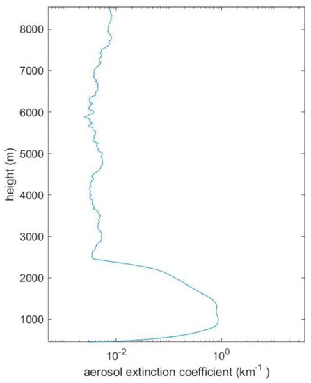 After retrieving Mie lidar data using the Fernald method, we obtain daily extinction coefficient data for 2021. Figure 4 shows the aerosol extinction coefficient at different heights on 29 January 2021, 2:00 am. The aerosol extinction coefficient decreases after reaching a peak of 0.88 km-1 at latitude 997.6 m. The coefficient decrease is due to the low aerosol density in the upper layer. However, the rapid decrease in aerosol extinction coefficient below 997.6 m is due to uncorrected overlap in the original data. From the surface to near 2509 m, the aerosol extinction coefficient has a variation of 0.88 km-1. However, it remains almost constant above 2509 m, ranging from 0.0024 km-1 to 0.0081 km-1. This implies that aerosols are mainly distributed below 3 km, which is in concordance with previous studies [41].