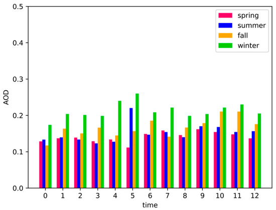 Aerosol optical depth can be calculated by integrating the extinction coefficient. As demonstrated in Figure 7, AOD in different seasons changes slightly from 0 am to 12 am. The daily average AOD for Sansha and Hefei is 0.2 and 0.4, respectively. For Sansha, average AOD for each season is as follows: 0.14 in spring, 0.18 in summer, 0.13 in fall and 0.21 in winter. Hefei’s seasonal average AOD is: 0.4 in spring, 0.31 in summer, 0.33 in fall and 0.48 in winter. Since Hefei is an economically developed city with high population while Sansha is on an island in the South China Sea, Hefei’s level of pollution is higher than Sansha’s. Furthermore, dense population and rapid urbanization can result in higher aerosol pollution [42] and higher AOD value [43].