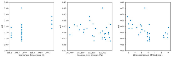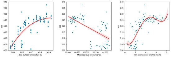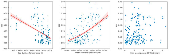 In summer (June, July and August), AOD is positively associated with sea surface temperature, as shown in the first sub-figure in Figure 10. When sea surface temperature is above 302.8 K, AOD is above 0.2. In addition, AOD and mean level pressure also have a weak negative correlation. When mean sea level pressure is below 100,500 Pa, AOD values gather around 0.25. When mean sea level pressure is above 100,500 Pa, AOD concentrates around 0.16 or 0.03. The third sub-figure in Figure 10 implies that AOD has a strong positive correlation with wind speed. When the 10 m u-component of wind is below 4 (ms−1), AOD increases at a rate of 0.06. After wind speed reaches 4 (ms-1), AOD remains constant around 0.25.