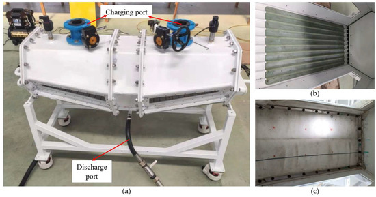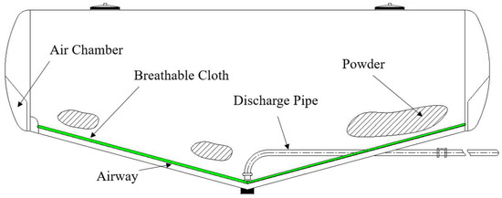 To check that the simulation’s results are accurate, the fluidized bed model of a powder tank truck is scaled down to perform the actual powder unloading test. The scaled model is shown in Figure 8a. Figure 8b shows the airway section in the experimental device and Figure 8c shows the airway section with breathable cloth. Test process: First, the discharge valve is closed before the start of the test and powder is loaded into the powder tank car through the charging port. Powder thickness is spread equally on the breathable cloth to observe the more evident fluidization state. Each test protocol uses the same weight, the same type of powder, and test parameters to reduce the error caused by additional factors. Then, gas is compressed to the air plenum at both ends of the model by an air compressor with an output power of 100 MPa, compressed gas flow through the air plenum to the airway, where on the breathable fabric of powder under the action of compressed gas began to flow, the pressure inside the tank reaches the required pressure, slowly opens the discharge valve, with the fluidization powder together with the gas flow to the discharge port. Finally, the remaining amount of powder on the fluidized bed’s breathable cloth is selected to compare the fluidization effect of each scheme.
