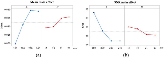 A main effect occurs when different levels of control factors exert varying influences on quality characteristics; the main effect will be more evident the steeper the curve is sloped. The main effect is determined to exist in H and L by comparing the mean values of the two factors at various levels and the main-effect diagrams of SNR in Figure 4. Between H and L, the main effect value of L is higher, exerting a greater effect on mass characteristics. Meanwhile, the main-effect value of H is smaller and H’s main effect value is smaller, exerting a smaller effect on mass characteristics. Therefore, the choice of L requires greater consideration.