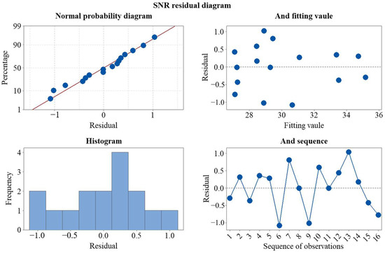 A residual diagram can be applied to determine if a model is correct and compliant with the aforementioned assumptions. This diagram is composed of a normal probability diagram, a fitting value diagram, a histogram, and a sequence diagram of residual error. The residual diagram of SNR is presented in Figure 5. The normal probability plot of the residual can verify whether the SNR residual meets the normal distribution. The SNR data points closely encircle a straight line in the residual’s normal probability plot; thus, SNR conforms to the normal distribution. The residual’s fitting value graph can be used to determine whether the residual displays a random distribution. The fitting value graph’s points are randomly positioned on either side of the zero value; hence, the model demonstrates reliable random distribution. As shown in the histogram of the residual, it shows a trend of normal distribution and there are no columns away from the overall position and, thus, no abnormal data point exists. The graph and sequence of residuals show that the residuals in the graph are randomly distributed about the centerline and the residuals do not exhibit any particular trend; hence, the residuals demonstrate good independence.