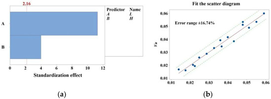 where Vu, L, and H represent the uniformity of velocity distribution, airway arc length, and airway height, respectively. The absolute value of the coefficients of each parameter in Equation (11) is drawn in descending order. As demonstrated in Figure 6a, the reference line is established at a level of significance of 0.05. According to the illustration, the height and arc length of airways exhibit statistically significant effects, with airway arc length exerting a greater effect than airway height.