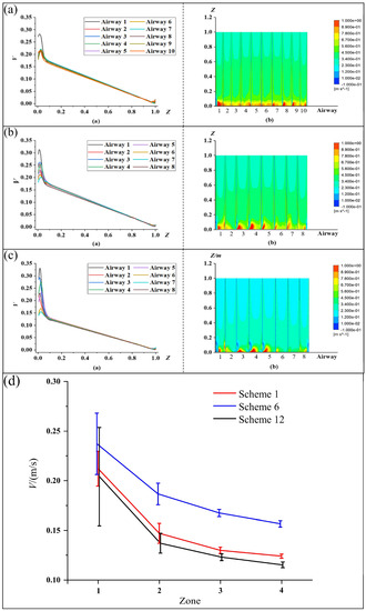 Along the Z-axis direction of the program attenuation curves, the speed of the gas into the airway at the entrance of the airway can be observed, a velocity attenuation in the first place, the gas velocity attenuation range of Scheme 1 is small, scheme of 12 attenuation sharpest, Scheme 6 attenuation amplitude in the middle level, and then along the Z axis direction for uniform stability of gas flow velocity attenuation. To more intuitively compare the difference in uniformity of velocity distribution among the three schemes, we divided the range 0 < Z < 0.2 into four equal zones and calculated the average value and standard deviation of the inlet velocity in the airway in each of the four zones, as shown in Figure 7d. It can be seen from the figure that the average velocity gradually decays as the gas flows in the airway. It can be seen from the figure that the average velocity of the gas gradually decreases as it flows in the airway. On the other hand, the standard deviation of the three schemes also decreases as the mean velocity decreases, with Scheme 1 having the smallest standard deviation of the gas flow velocity in all four intervals, with values decreasing by 43.2%, 7.7%, 11.1%, 37.5%, and 64.5%, 0.1%, 3.5%, and 29.1% relative to Schemes 6 and 12, respectively.