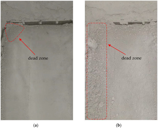 Figure 9a,b present the test results of Schemes 1 and 12, respectively. The experimental results showed that in the model using Scheme 12, a large amount of powder remained in the corners of the fluidized bed after unloading, forming a dead zone of fluidization, while the model using Scheme 1 had a significantly reduced amount of powder residue and a significantly smaller dead zone after unloading. The residual powder was weighed and the powder residual rate was about 0.23% for Scheme 1 and 0.34% for Scheme 12. In addition, the overall fluidization effect of Scheme 1 was better. The experimental results are consistent with those obtained by the Taguchi method, which can also prove the correctness of the numerical simulation method in this paper.