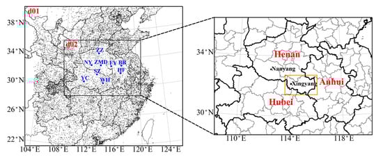 Model domain, distribution of radar and surface observation stations, the geographic information of the area of interest and other geographic conditions. The big blue spots represent the locations of the radar stations from Zhumadian (ZMD), Nanyang (NY), Suizhou (SZ), Fuyang (FY), Hefei (HF), Bengbu (BB), Zhengzhou (ZZ), Wuhan (WH), Yichang (YC). The small black spots represent the locations of surface data stations in the left panel. The orange box represents the area of interest, the black dot represents the location of Xinyang City, Henan Province, and the black triangle represents the location of the Nanyang Sounding Station in the right panel.