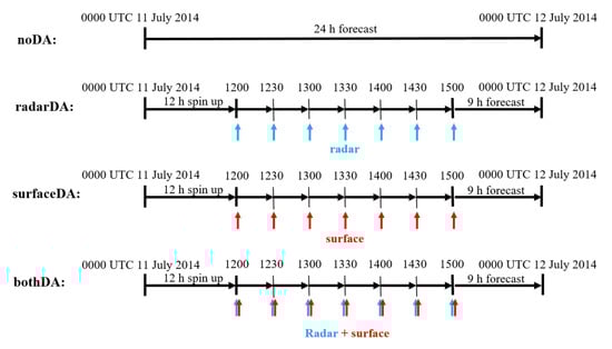 In order to explore the impact of radar and surface data assimilation on the forecast of this nocturnal squall line, four experiments are designed (Figure 2). The first experiment (noDA experiment) is a control experiment with no data assimilation, the second experiment (radarDA experiment) only assimilates the radar data, the third experiment (surfaceDA experiment) only assimilates the surface data and the fourth experiment (bothDA experiment) assimilates both the radar data and surface data simultaneously. Among them, the noDA experiment makes a 24 h forecast from 0000 UTC 11 July to 0000 UTC 12 July 2014, while in the radarDA, surfaceDA, and both DA experiments, the model is integrated from 0000 UTC to 1200 UTC 11 July, and then the observation data are assimilated every 30 min from 1200 UTC to 1500 UTC. The analysis field at 1500 UTC is used as the initial forecast field, and finally, the deterministic forecast is made for 9 h to 0000 UTC 12 July.