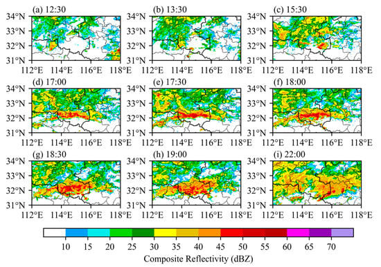 The mosaics of radar composite reflectivity (shaded, units: dBZ) at (a) 1230, (b) 1330, (c) 1530, (d) 1700, (e) 1730, (f) 1800, (g) 1830, (h) 1900, (i) 2200 UTC 11 July 2014.