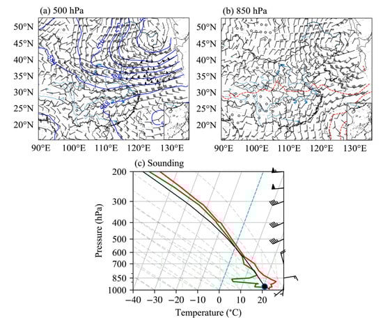 Figure 4 shows the environmental conditions before the squall line initiated at 1200 UTC 11 July. As can be seen from Figure 4a at 500 hPa, there was a vortex in northeast China. A low trough was formed in the Sichuan Basin. The subtropical high extended westward to around 110° E. At 850 hPa in Figure 4b, there was a low-level shear line in the Yangtze–Huaihe River, and a southwest vortex on the west side of the shear line. The warm and humid southwesterly wind converged with the dry and cold northerly wind at the junction of Henan, Hubei and Anhui. The convergence zone was located on the Meiyu front (Figure 4b). Thus, the environmental conditions were favorable for the convection initiation.