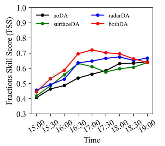 Figure 6 shows the averaged fractions skill scores (FSS) of the radar composite reflectivity at different thresholds (10, 15, 20, 25, 30, 35, 40, 45, 50 dBZ) for noDA, radarDA, surfaceDA and bothDA experiments. The score area is consistent with the panel area in Figure 5. Overall, the three assimilation experiments have made better forecasts of radar reflectivity from 1500 to 1900 UTC than the noDA experiment. From the formation stage to the mature stage of the squall line (1530–1830 UTC), the improvement in radar reflectivity prediction in the bothDA experiment is greater than that in the radarDA and surfaceDA experiments. During the early stage of the squall line formation (1530–1630 UTC), the effect on the forecast of radar reflectivity in the radarDA experiment is slightly worse than that in the surfaceDA experiment, but it becomes better at a later time. The FSS of the surfaceDA experiment is slightly lower than that of the NoDA experiment at the mature stage of the squall line. This may be related to the weak reflectivity predicted by surfaceDA experiment.