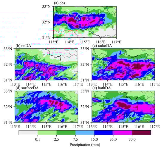 To further investigate the impact of assimilation on the squall line forecast, Figure 7 analyzes the accumulated precipitation for 6 h (1500–2100 UTC 11 July) from observations and four experiments. The four experiments are the same in the previous section. In the observation (Figure 7a), an east–west rain band with strong radar composite reflectivity is located at the border of Henan, Hubei and Anhui. The center of heavy precipitation is in Xinyang city, Henan province, with the maximum precipitation exceeding 70 mm. The center of heavy precipitation predicted by the noDA experiment is southward, with strong spurious precipitation in the northern part of the Hubei province (Figure 7b). For the radarDA experiment, the intensity of heavy precipitation has been improved, but false or spurious precipitation appears at the border of the Henan and Anhui province, as well as the northeastern Hubei province (Figure 7c). The surfaceDA experiment reduces spurious precipitation and improves the precipitation fall zone effectively, but the intensity of precipitation is weak (Figure 7d). On the other hand, bothDA experiments can improve both the fall zone and intensity of precipitation and partly reduce spurious precipitation within the Hubei province (Figure 7e).