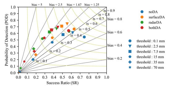 In order to quantitatively evaluate the effect of the three assimilation experiments on the precipitation prediction, the performance diagram of 6 h (1500 to 2100 UTC 11 July 2014) accumulated precipitation for noDA, radarDA, surfaceDA and bothDA experiments is shown in Figure 8. The assimilation of radar and/or surface data positively contributes to the precipitation forecast. Specifically, for light precipitation threshold (≤15 mm), the prediction effect of accumulated precipitation in the surfaceDA experiment is the best, the prediction effect in the radarDA experiment is relatively poor and the bothDA experiment is at a moderate level. As the precipitation magnitude increases, when the precipitation threshold is 35mm, the scores of the three assimilation experiments become close, and the radarDA experiment is the best. When the precipitation threshold is further increased to 70mm, the precipitation forecast in the bothDA experiment becomes the best. The forecast in the radarDA experiment is also better than that in the surfaceDA experiment.