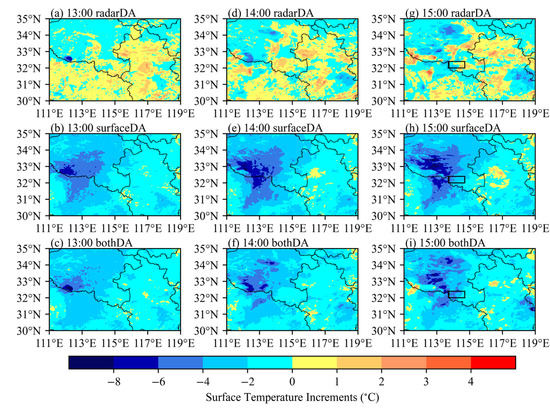 The surface temperature increments of the three assimilation experiments (shaded, unit: °C) at (a–c) 1300, (d–f) 1400 and (g–i) 1500 UTC 11 July 2014. The black box in (g–i) is where the squall line initiated.