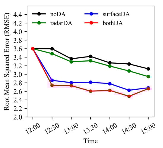 The Root Mean Squared Error (RMSE) for the surface temperature from 1200 to 1500 UTC 11 July 2014 for noDA (black dotted line), radarDA (green dotted line), surfaceDA (blue dotted line) and bothDA (red dotted line) experiments. The score area is the same as the panel area in Figure 9.
