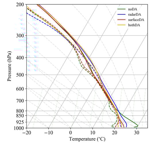 Then, we analyze the thermodynamic structure difference in the four experiments by comparing the soundings at 1530 UTC (Figure 11). The noDA experiment has high temperatures at the bottom of the boundary layer (~30 °C). There is a surface temperature inversion, but a sharp temperature drop appears in 960 hPa–800 hPa, and the overall thermal environment in the boundary layer is relatively unstable. For the radarDA experiment, the surface temperature decreases to about 25 °C, and the temperature within the boundary layer decreases slowly with the increase in height. Thus, its thermal environment is more stable than that in the noDA experiment. Moreover, the near-surface temperature is about 24 °C with less variation in the height at the low levels in the surfaceDA experiment; the boundary layer has a more stable thermal environment than the radarDA experiment. The bothDA experiment has the lowest near-surface temperature (~23 °C), and there is temperature inversion within the boundary layer. Thus, it has the most stable thermal environment.