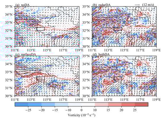 Since the boundary layer is stable at night and the wind convergence occurs above the boundary layer, the 800hPa wind and vorticity fields are plotted in Figure 12. The southern side of the black box is dominated by southerly winds with lower speed, and the vorticity inside the box is very weak, resulting in almost no upward movement in the noDA experiment (Figure 12a). After assimilating the observation data, the vorticity on the southwest side of the box is significantly enhanced, and a positive vorticity center is generated at the southwest side of the box (Figure 12b–d). A relatively complete vortex system is formed (Figure 12b), while the surfaceDA experiment does not form a closed vortex system (Figure 12c), and the bothDA experiment generates a complete low vortex system (Figure 12d), which is the southwest vortex described in Section 3.2. This shows that both the radar and surface data assimilation can adjust the circulation patterns to improve the southwest vortex system and significantly enhance the intensity of the southerly winds, which in turn enhances the convergence of the southerly and northerly winds inside the box. To put it specifically, the radarDA experiment and bothDA experiment have stronger vorticity and convergence, while the surfaceDA experiment has relatively weaker vorticity and convergence.