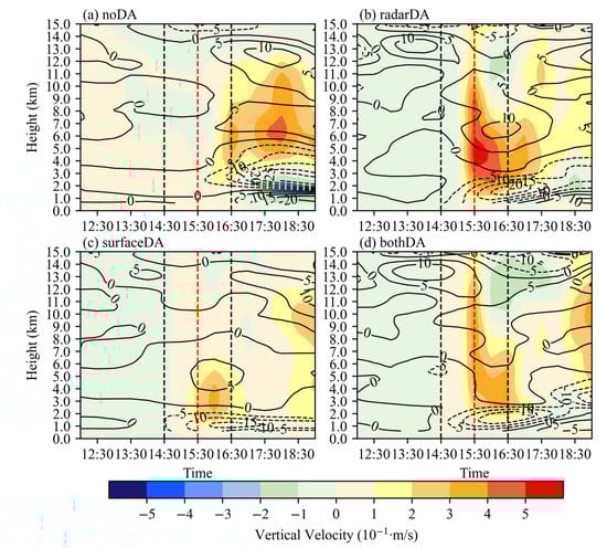 The time–height cross sections of area-averaged vertical velocity (shaded, units: 10−1∙m/s) and divergence (contour, units:10−5∙s−1) from 1200 UTC to 1900 UTC 11 July 2014 for (a) noDA, (b) radarDA, (c) surfaceDA and (d) bothDA experiments. The averaged area is denoted by the black box in Figure 12. The red dotted line represents the time of the squall line initiation, and the two black dotted lines represent the time near the squall line initiation.