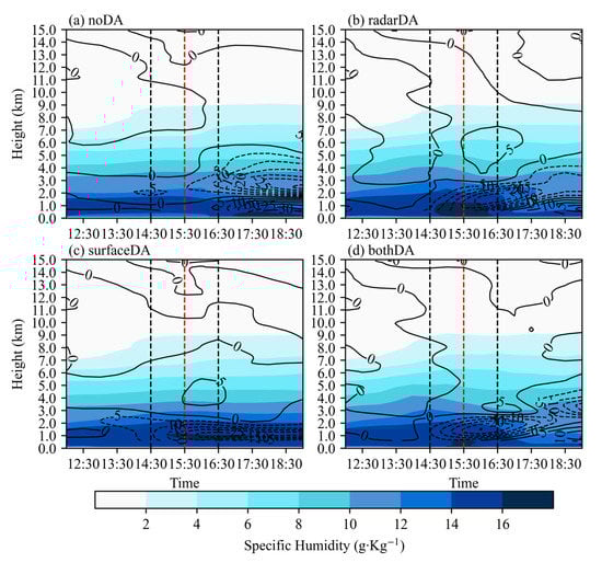 Figure 14 shows the time–height cross sections of area-averaged specific humidity and the water vapor flux divergence. During the early stage of the squall line formation (1430–1630 UTC), the noDA experiment produces less low-level water vapor (Figure 14a). However, all three assimilation experiments produce apparent water vapor convergence at the low level, with a peak in water vapor flux divergence of about −25 × 10−5∙s−1. Additionally, the specific humidity at the low level is enhanced with a maximum specific humidity larger than 16 g∙kg−1 (Figure 14b–d).