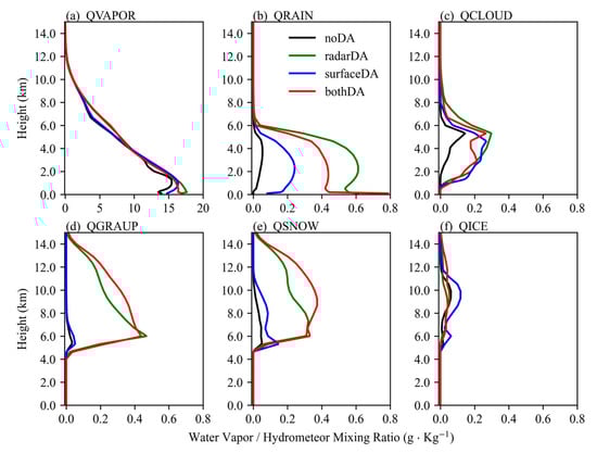 Figure 15 shows the vertical distribution of the area-averaged water vapor and hydrometeor mixing ratios from different experiments. As shown in Figure 15a, the increase in the water vapor mixing ratio (QVAPOR) is largest (about 4 g∙Kg−1) in the radaDA experiment, smallest in the surfaceDA experiment, and in between in the bothDA experiment. At an altitude of 4–9 km, the radarDA and bothDA experiments can also effectively increase QVAPOR. However, the surfaceDA experiment has little influence on it. For the vertical profiles of hydrometeor mixing ratios (Figure 15b–f), the radarDA and bothDA experiments can increase the amount of the rainwater mixing ratio (QRAIN) and cloud water mixing ratio (QCLOUD) up to 0.5 g∙Kg−1 and 0.2 g∙Kg−1 at 0–6 km, respectively, and increase the amount of the graupel mixing ratio (QGRAUP) and snow mixing ratio (QSNOW) up to 0.5 g∙Kg−1 at 5–15 km. However, the surfaceDA experiment has little effect on QRAIN and QCLOUD. All assimilation experiments have a smaller impact on the amount of the ice mixing ratio (QICE) than other hydrometeor mixing ratios.