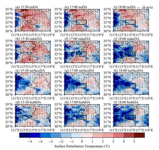 When the squall line is initiated at 1530 UTC, there is no surface cold pool in the noDA experiment (Figure 16a), while all three assimilation experiments generate surface cold pools (Figure 16b–d). Then, the cold pools in all three assimilation experiments continue to enhance and expand eastward (1700 UTC, Figure 16e–h). During the squall line mature stage (1800 UTC, Figure 16i–l), the noDA experiment generates a weak surface cold pool in southern Henan, while the cold pools of the three assimilation experiments cover the whole southern Henan. Among them, the cold pool of the radarDA and bothDA experiments is stronger than that in the surfaceDA experiment, and the cold pool strength center in the radarDA and bothDA experiments is southward, while the cold pool center is northerly in the surfaceDA experiment. This is mainly related to the position and intensity of the squall lines generated in the three assimilation experiments. The squall line predicted in the surfaceDA experiment is located in the north with weak intensity, which makes the precipitation position to the north and causes less precipitation, leading to a weak cold pool by precipitation evaporation and a northward center. The position and intensity of the squall line are predicted more accurately in the radarDA and bothDA experiments, resulting in a more accurate center and intensity of the cold pool. It can also be found that the cold pool outflow exists in all three assimilation experiments, and the intensity of the cold pool outflow is related to the cold pool intensity. When the outflow from the cold pool meets with the airflow from the south, it is easy to initiate new convection and then promote the maintenance and development of the squall line.