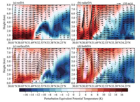 To further analyze the influence of the cold pool and outflow on the maintenance of the squall line, Figure 17 shows the south–north cross sections of in-plane flow vectors and perturbation equivalent potential temperature along 114.6° E at 1800 11 July 2014 for the four experiments. The noDA experiment produces a weak cold center near 32.55° N only near to the surface (Figure 17a). In contrast, a strong cold pool exists in the low troposphere in all three assimilation experiments, and the leading edge of the cold pool reaches near 31.5° N (Figure 17b–d). At the same time, both radarDA and bothDA experiments have strong cold pool outflow north of 31.5° N, and produce strong vertical ascending motion with the generation of new convection near 31° N, promoting development and maintenance of the squall line, while the surfaceDA experiment has weaker outflow at low levels, which has little impact on the development and maintenance of the squall line.
