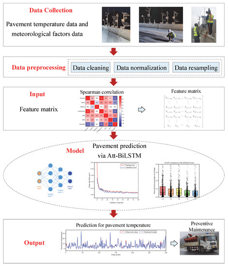 Figure 1 provides the general outline of the research, which consisted of three main steps. (1) The first step was the collection and preprocessing of winter pavement temperature data and meteorological element data. In order to collect accurate data, several road weather stations were installed and checked regularly to ensure the stations worked well. To further improve the data quality, data preprocessing was conducted. (2) The second step determined the model inputs by Spearman correlation coefficients. The input feature matrix had a significant impact on the model, and important variable extraction was performed in order to capture the influence of meteorological factors on pavement temperature and pavement temperature time series characteristics. (3) The third step established the optimal pavement temperature prediction model by adjusting the model hyperparameters to predict the future pavement temperature. The hyperparameters controlled the performance of the model, and in order to obtain the optimal model, the optimal values of parameters such as the size of the sliding window, the number of hidden layer neurons, and the optimizer were obtained through the experiment. Finally, the established attention-based BiLSTM model was used for pavement temperature prediction to further support preventive maintenance.