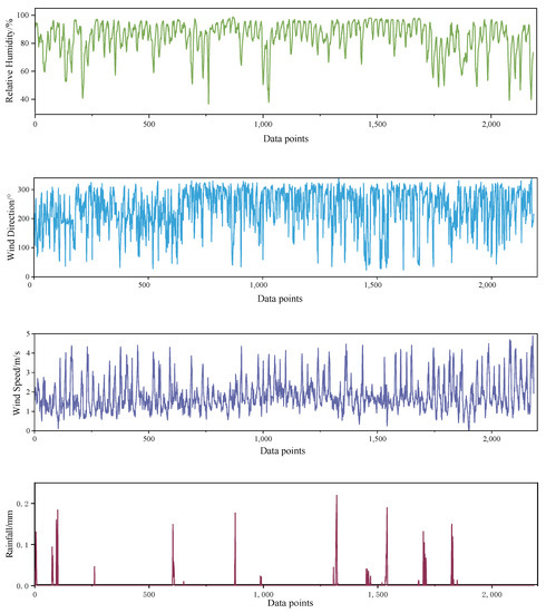 The correlation coefficient between air temperature and pavement temperature was 0.9, indicating an extremely strong correlation between air temperature and road surface temperature. The correlation coefficients between wind speed, rainfall, visibility, and relative humidity were weakly correlated with pavement temperature, with correlation coefficients of 0.42, 0.37, 0.37, and −0.61, respectively. The correlation coefficient between wind direction and pavement temperature was 0.035, indicating a very weak correlation between wind direction and pavement temperature. Based on the Spearman correlation coefficient results, air temperature, wind speed, rainfall, relative humidity, and previous road surface temperature were selected as input features.