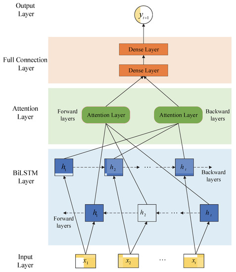 In this paper, an attention-based BiLSTM deep learning model for pavement temperature prediction was proposed. The model consists of five parts: an input layer, BiLSTM layer, attention layer, fully connected layer, and output layer. Figure 5 illustrates the overall architecture of the Att-BiLSTM model. The BiLSTM layer is capable of extracting features from the front and back directions of the pavement temperature time series data. After that, the important features are further extracted using the attention layer to form a new feature vector. The attention mechanism was introduced mainly to optimize the LSTM structure to compensate for its lack of ability to give different levels of attention to features over multiple time steps. Finally, the attention layer is followed by the fully connected (FC) layers, which are regression layers used to make predictions. Each module will be described in detail in the following subsections.