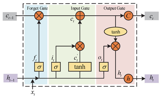 where is the moment; is the current moment input; is forget gate; is input gate; is a temporary cell state; is a cell state; is output gate; is the output of the hidden layer at the current moment; is the state of the cell at the previous moment; is the output of the hidden layer at the previous moment; , , , are the weights to be learned, respectively; , , , are the offsets to be learned; is the activation function.