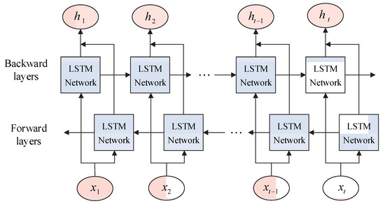 Although LSTM overcomes the limitations of RNNs, it can still only process sequence information from the past and cannot utilize front sequence information. Huang et al. [22] proposed a bidirectional LSTM (BiLSTM) including forward and backward LSTM layers, as shown in Figure 7. A BiLSTM is able to integrate and process information from both the front and rear, capturing road temperature and associated parameter time information more effectively.