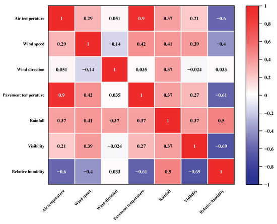 We aimed to reduce the complexity of the model input and improve the accuracy of the prediction model. The characteristic variables with significant correlation with the predicted target value of the pavement temperature were used as the input variables of the pavement temperature prediction model. Considering the possible nonlinear correlation between meteorological characteristics and pavement temperature, a Spearman correlation analysis was performed for the six meteorological characteristics variables as well as pavement temperature. The Spearman’s rank correlation coefficient method is often used to analyze the closeness of a relationship between two variables and is calculated as: