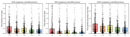 Errors comparison with different hours. MAE (left), MSE (middle), MAPE (right).