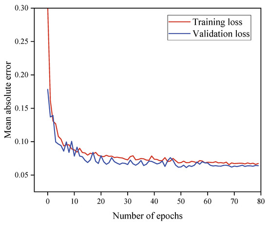 Figure 11 shows the prediction performance of the model in the training and validation sets, through which the performance of the model on the training and validation data can be evaluated to obtain the best epochs and prevent the model from overfitting or underfitting. It can find that in terms of training and validation data, the MAE gradually decreases as the epoch increases, which indicates that the model accuracy improves. The validation loss of the model is mostly lower than the training loss, and when the epoch is roughly 70, both the training loss and validation loss tend to be smooth, which suggests that the optimal epochs are around 70.