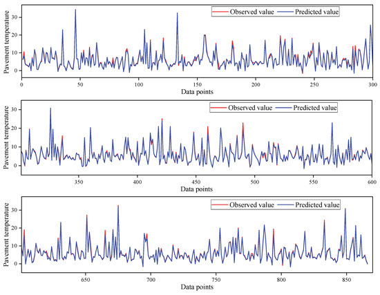 Comparison of pavement temperature truth and predicted values in the test set. Data points 1–300 in the test set (first), Data points 301–600 in the test set (second), Data points 601–866 in the test set (third).