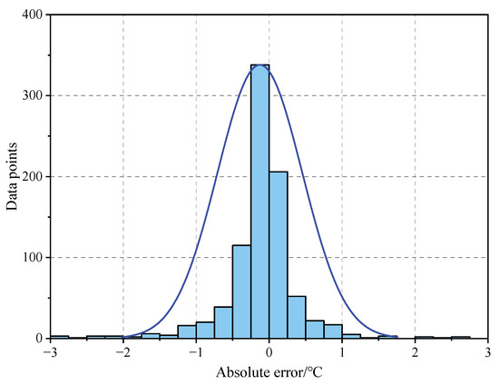 Figure 13 shows the absolute errors of the predicted values of the proposed model and observed values. It can be seen that 93.4% of the absolute error is less than 1 °C, and 82.1% of the absolute error is less than 0.5 °C, which indicates that the model has a good predictive effect.