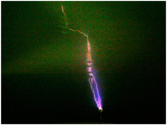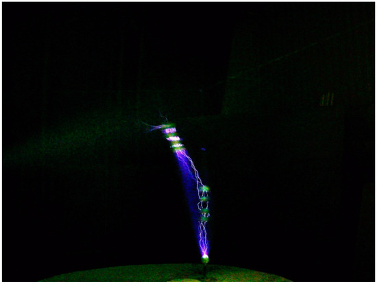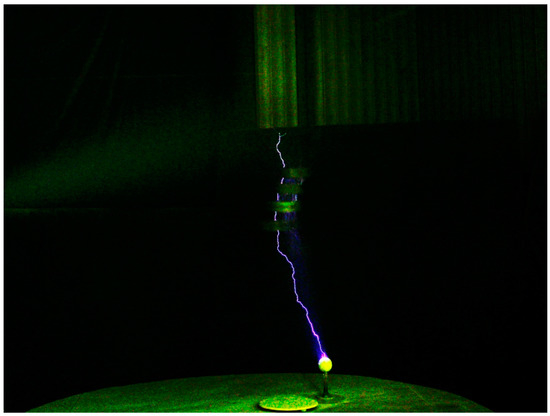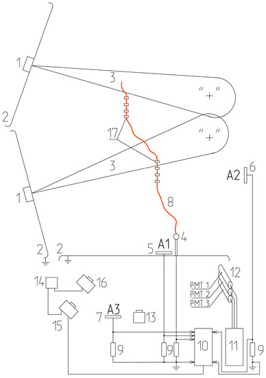 Physical modeling of the processes of positive multistrike lightning occurrence with the use of several positively charged ATCs has been performed on the experimental complex “GROZA” [34,35,36]. The basic scheme of the experimental measurement complex is shown in Figure 1.